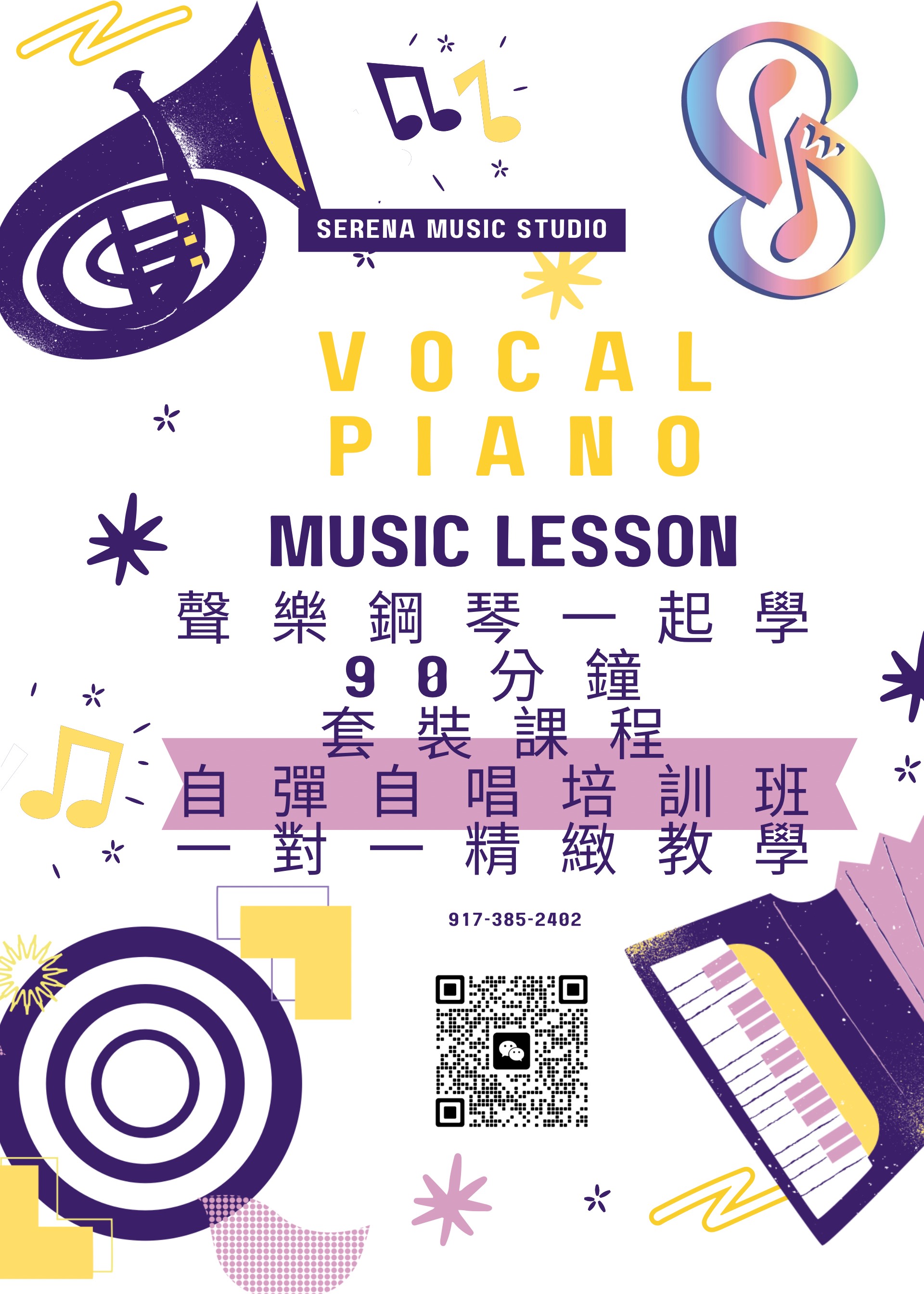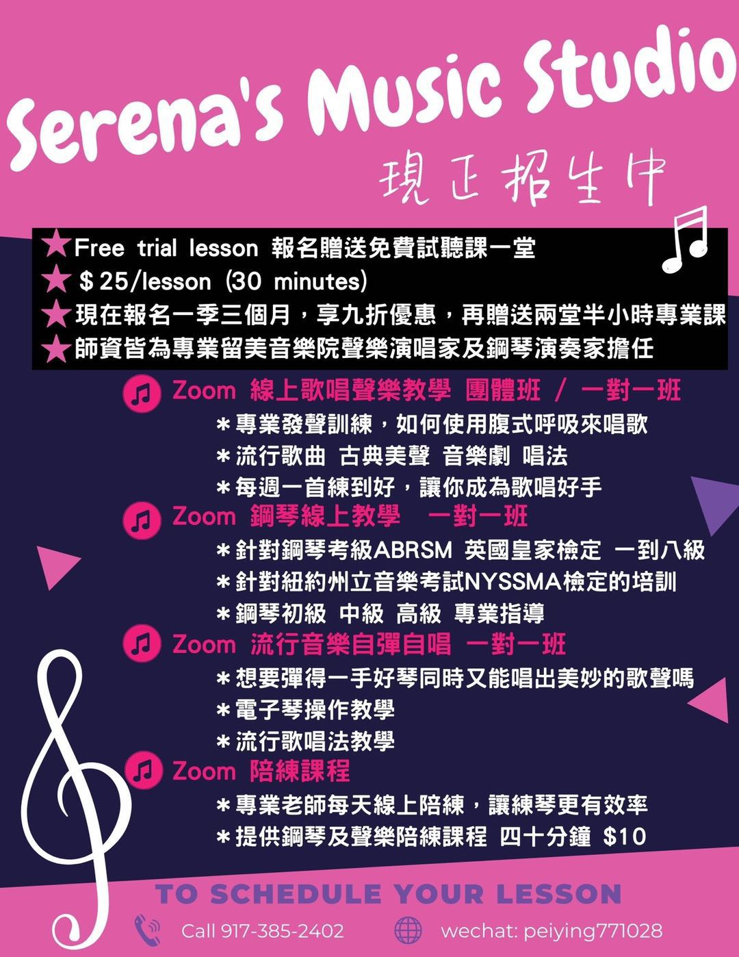 Ms. Wang has abundant music teaching experience in New York, She has been teaching vocal and piano for five years and her students all passed the ABRSM piano 1-6 levels and NYSSMA music exam. She conducted her music studio successfully and has strongly professional training experience. In addition, she is being patient and encourage to accompany with students to get their improvement these years.